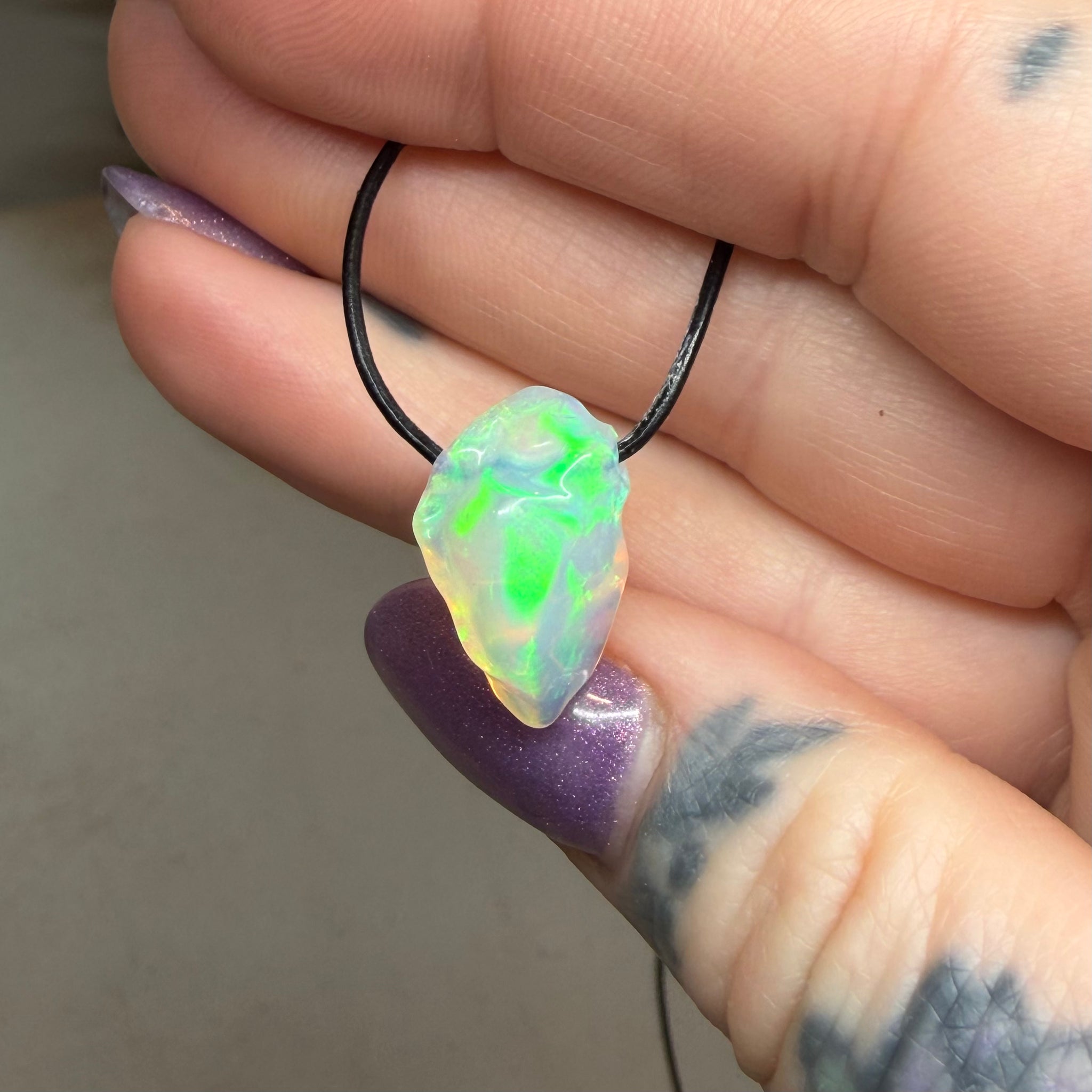 5.825ct hand selected high quality Ethiopian Opal Opal, polished and drilled in USA. Comes on 1mm thick leather cord.